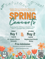 The Eastern Sierra Community Choir along with the Mammoth High School Choir Present our Spring Concert featuring Eric Whitacre selections form ESCC's recent Carnegie Hall Performance.