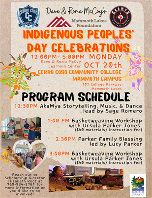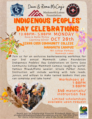 Join Mammoth Lakes Foundation on Monday, October 20th at Cerro Coso Community College Mammoth campus to celebrate the rich Native culture of the Eastern Sierra with Five Generations of Parker Family Basketweavers, the Akamya Cultural Group, and the Native American Student Support & Success Program. Experience vibrant presentations of song, dance, and storytelling, plus explore vendor booths and interactive displays.