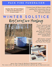 Drop in, reset and recharge with a Yoga and Sound Bath Winter Solstice Fundraiser for the Pack Fire. Tapping into the healing power of alchemy crystal bowls and group meditation in the Sierras. Together, we’ll send love and strength while holding space for our friends in McGee and beyond.